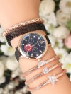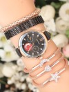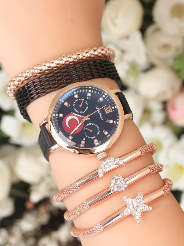 Siyah Deri Kordonlu Ay Yıldız Metal Kasa Bayan Saat ve Bileklik Kombini